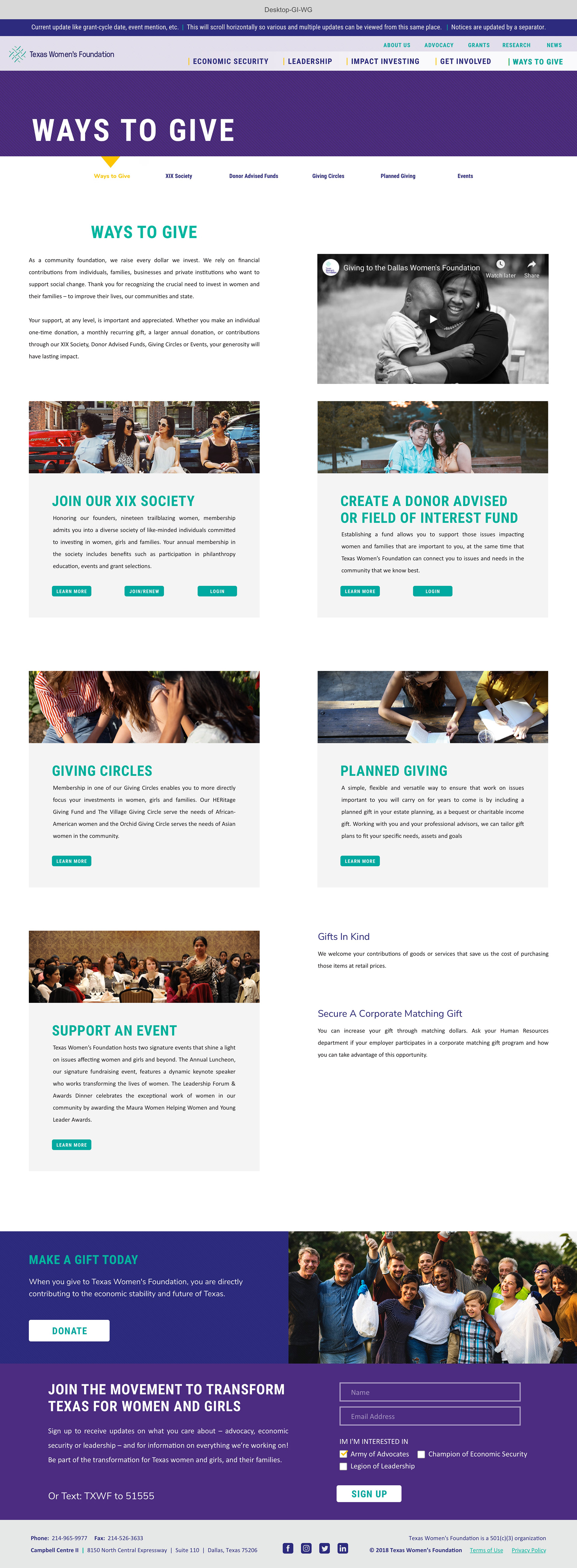 To transform Texas Women’s Foundation to support its city-to-state level expansion, I revamped their site to account for scalability and user needs. This included applying design standards with their new brand identity to simplify content, streamline navigation, and create intuitive design patterns for better content consumption. Visit Texas Women’s Foundation’s new website.