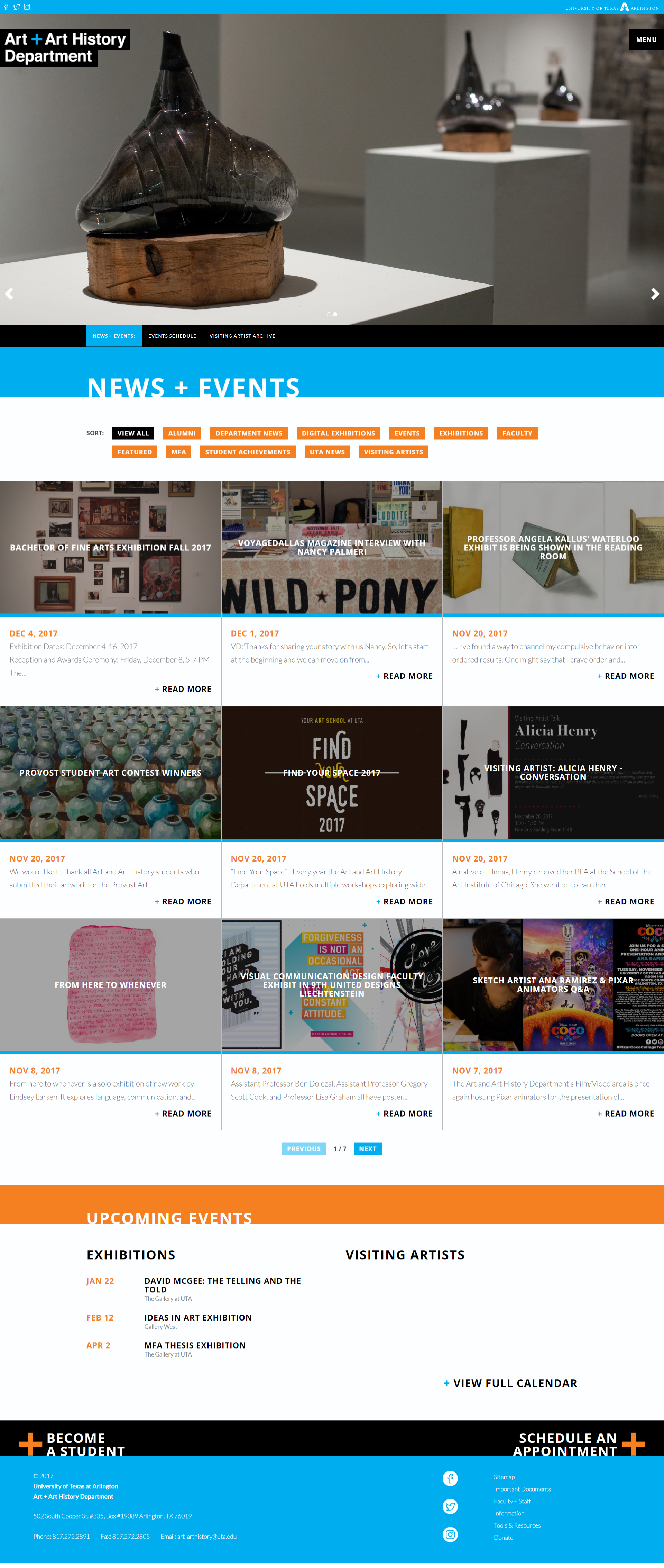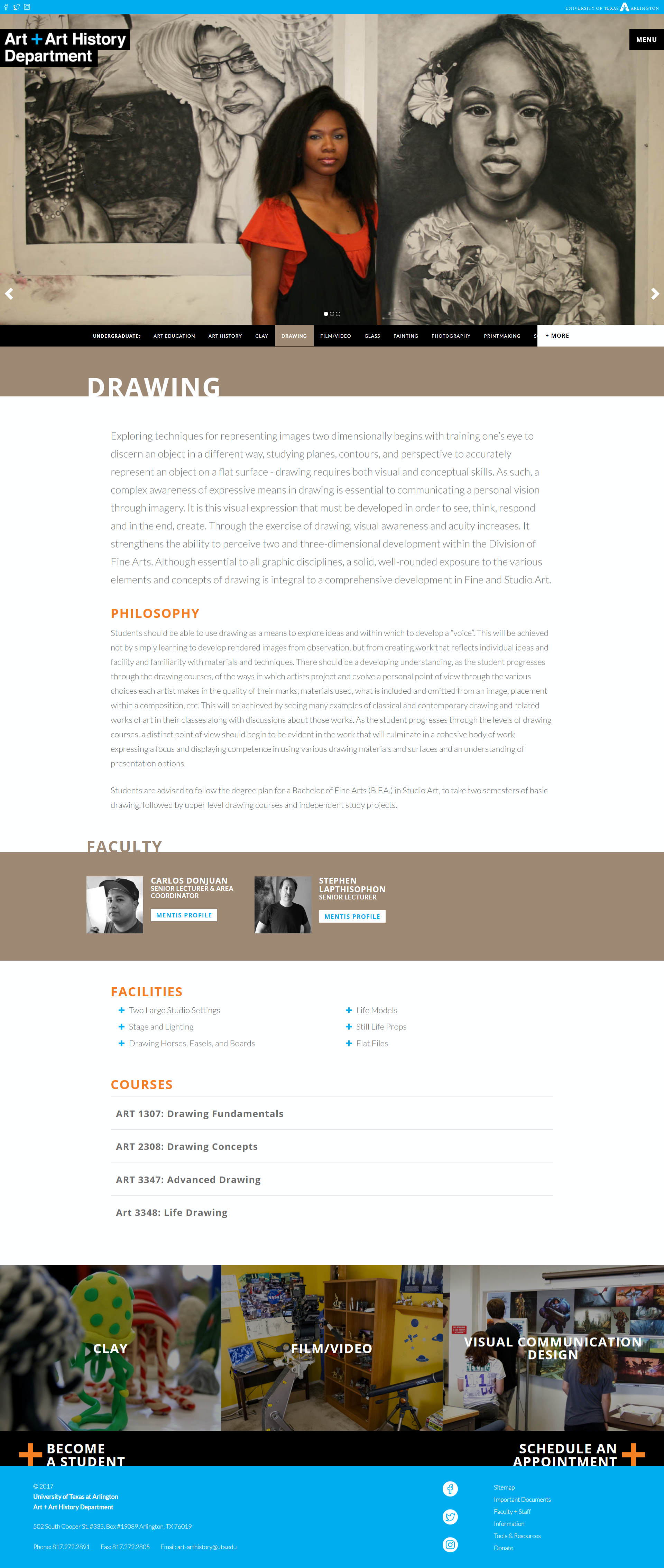 Heading the web design for the art and art history department, I kicked-off the design process with a competitive analysis, collegiate research, and user feedback. After much ideation to solve key issues, I created a branded modular site featuring color-coded student-level pages, refined navigation, and areas of study footers for smooth exploration.
